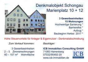 Die zu sanierenden Gebäude liegen direkt am Marienplatz sowie der Neubau in der Ballenhausstrasse im Zentrum von Schongau. Tolle Denkmalabschreibung ist hier möglich. Das ehemalige denkmalgeschützte Hotel am Marienplatz wir komplett saniert. Es entstehen zusammen mit dem Neubau in der Ballenhausstr. 15 Wohnungen und 2 - 3 Gewerbeeinheiten. Für ausreichend Parkmöglichkeiten ist gesorgt. 2 Garagen, 3 Carport und 10 Stellplätze sind direkt am Objekt. Durch erfolgte Ablösung weiterer Stellplätze bei der Gemeinde können die Nutzer die öffentlichen Stellplätze im Umfeld für 30 € und in einer nahegelegenen Tiefgarage für 60 € jährlich nutzen.